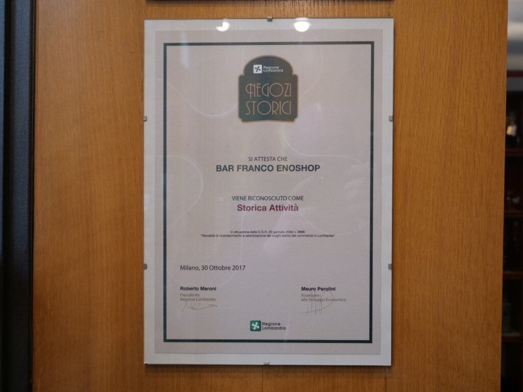30 Ottobre 2017, il Bar Franco Enoshop viene riconosciuto come attività storica dalla Regione Lombardia.